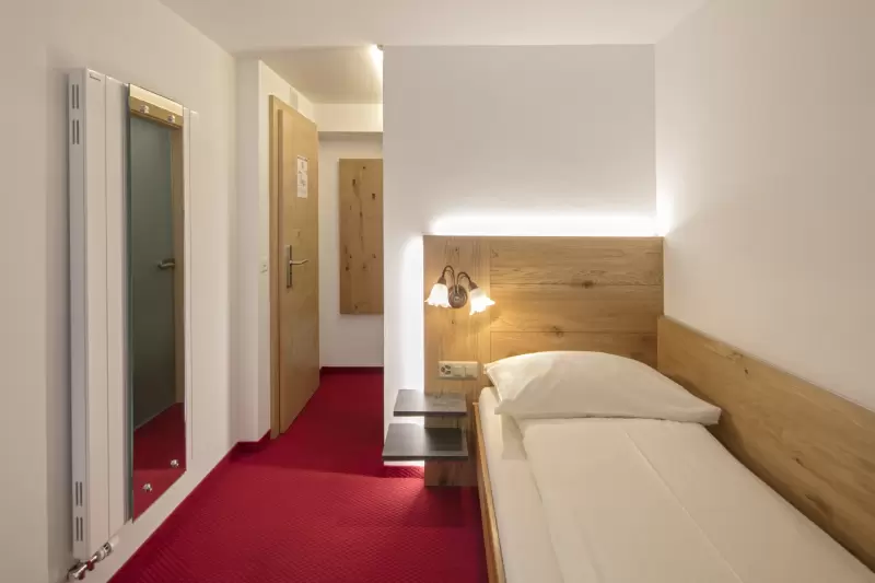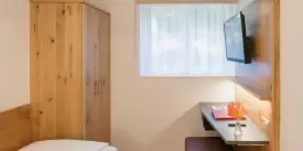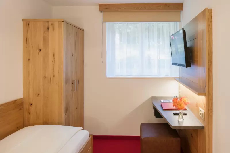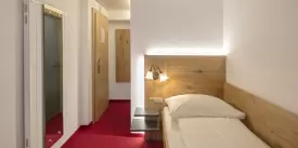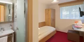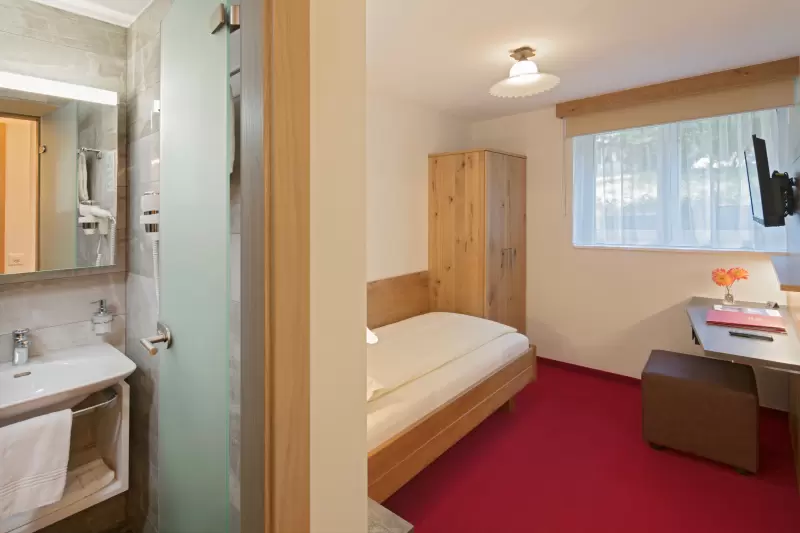 Preiswertes Einzelzimmer im Untergeschoss mit Flachbild-Kabel-TV, Radio, WLAN, Safe, Dusche/WC Haartrockner, Kosmetikspiegel und Hotelservice.