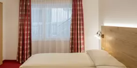 Gepflegtes Zweibettzimmer im Erdgeschoss mit Flachbild-Kabel-TV, Radio, WLAN, Safe, Dusche/WC Haartrockner, Kosmetikspiegel und Hotelservice.